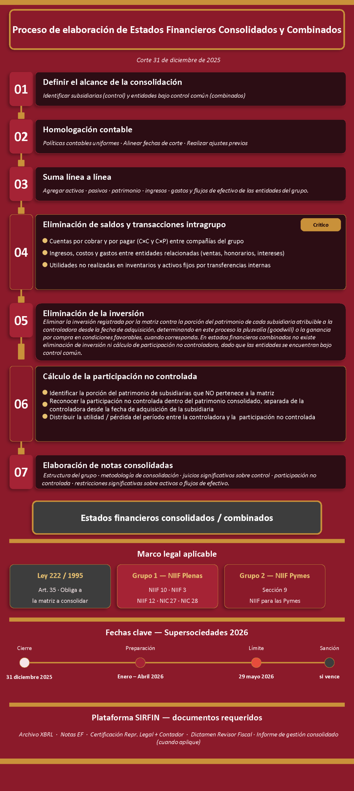 - Semana 6–7 Entregar el paquete completo al Revisor Fiscal para que emita el dictamen específico sobre los estados financieros consolidados o combinados.